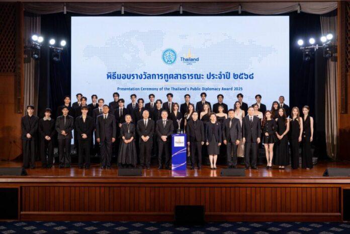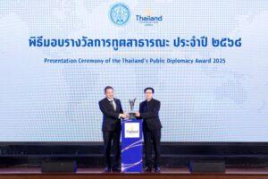 เมื่อวันที่ 2 ธันวาคม 2568 ที่ผ่านมา กระทรวงการต่างประเทศและมูลนิธิไทยจัดพิธีมอบรางวัลการทูตสาธารณะ ประจำปี 2568 (Thailand’s Public Diplomacy Award 2025 – TPDA2025) ณ ห้องวิเทศสโมสร กระทรวงการต่างประเทศ เพื่อยกย่ององค์กรที่มีบทบาทโดดเด่นในการเผยแพร่วัฒนธรรมไทย ถ่ายทอดความคิดสร้างสรรค์ และส่งเสริมภาพลักษณ์ประเทศไทยในระดับสากล ผ่านพลังของ Soft Power ไทย โดยในปีนี้มอบรางวัลแก่ องค์กรผู้ผลิตสื่อบันเทิงแนวหน้าที่ได้รับความนิยมจากผู้ชมทั่วโลก