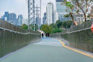 2. การออกแบบเพื่อทุกคน (Universal Design & Inclusion): กทม. ให้ความสำคัญอย่างสูงสุดกับการเข้าถึงพื้นที่ โดยโครงการได้ดำเนินการติดตั้งลิฟต์โดยสาร บริเวณจุดเชื่อมต่อสำคัญ และสร้างทางลาด (Ramp) ขนาดใหญ่ความยาวกว่า 57 เมตร ที่มีความลาดชันเหมาะสมตามมาตรฐานสากล เพื่อให้ผู้พิการที่ใช้รถเข็น ผู้สูงอายุ และครอบครัวที่ใช้รถเข็นเด็ก สามารถขึ้นมาใช้พื้นที่พักผ่อนลอยฟ้าได้อย่างเท่าเทียมกันเป็นครั้งแรก