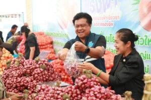 นอกจากสินค้าอุปโภคบริโภคแล้ว กรมฯ ยังได้เชื่อมโยงผลผลิตทางการเกษตรเพื่อยกระดับราคาสินค้าให้เกษตรกร โดยนำหอมแดงจากจังหวัดศรีสะเกษ และหอมหัวใหญ่จากสหกรณ์ผู้ปลูกหอมหัวใหญ่แม่วาง จังหวัดเชียงใหม่ มาจำหน่ายในงานด้วย ขณะเดียวกันยังได้นำถุงยังชีพพาณิชย์ที่บรรจุข้าวสาร อาหารแห้ง ยารักษาโรค และของใช้จำเป็น จำนวนกว่า 500 ชุด มอบให้แก่ประชาชนในพื้นที่ที่ได้รับผลกระทบจากสถานการณ์ชายแดน เพื่อเป็นการเยียวยาในเบื้องต้น